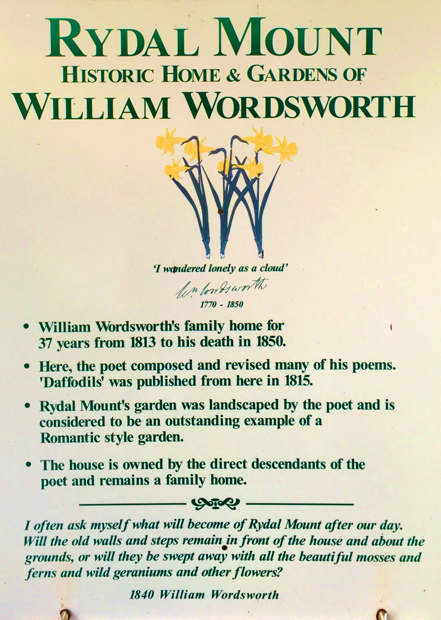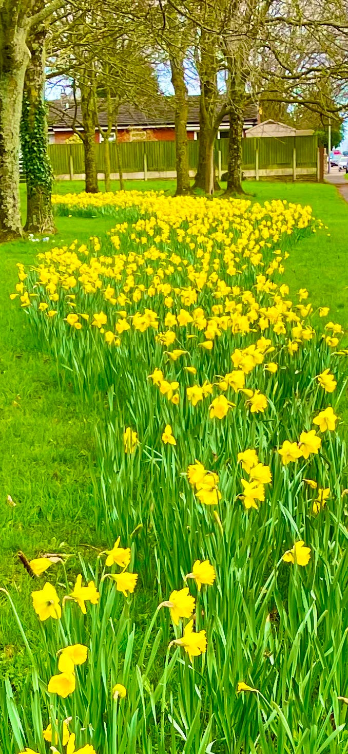 We visited Wordsworth’s home in the Lake District of Cumbria one November when, sadly, the daffodils had bloomed and gone. Idyllic and inspiring nonetheless, we learned about the field of daffodils he planted for his daughter, Dora. On her death, although both parents were 77 years old at the time, they personally planted the field with daffodils as a living memorial to their daughter. Each year these have multiplied and now provide a display of many thousands each spring. I always thought Will had employed poetic license to exaggerate the 10,000 daffodils he saw at a glance. But having lived in England for 9 years and seen the incredible natural abundance of these flowers, I know it to be true.
